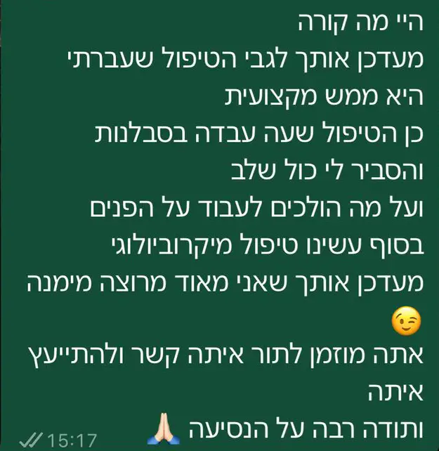 קובעים שיחת ייעוץ אישית עם שירה  ומקבלים הערכה מקצועית של מצב העור והמלצות מותאמות אישית – חינם וללא התחייבות. הטיפול הביתי מגיע עד אלייך עם שליח תוך ליווי ומעקב של שירה לאורך כל הדרך.